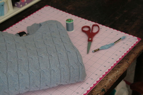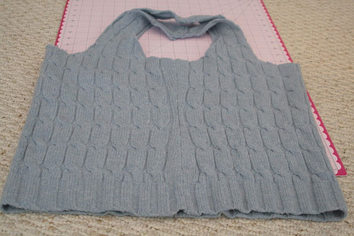 Шаг 3: Выверните сумочку наизнанку и сшейте нижние края свитера, чтобы получилось дно и обработайте обрезанные края по верху сумки и на ее ручках, обшив их лентой или полосками, вырезанными из рукавов свитера.
