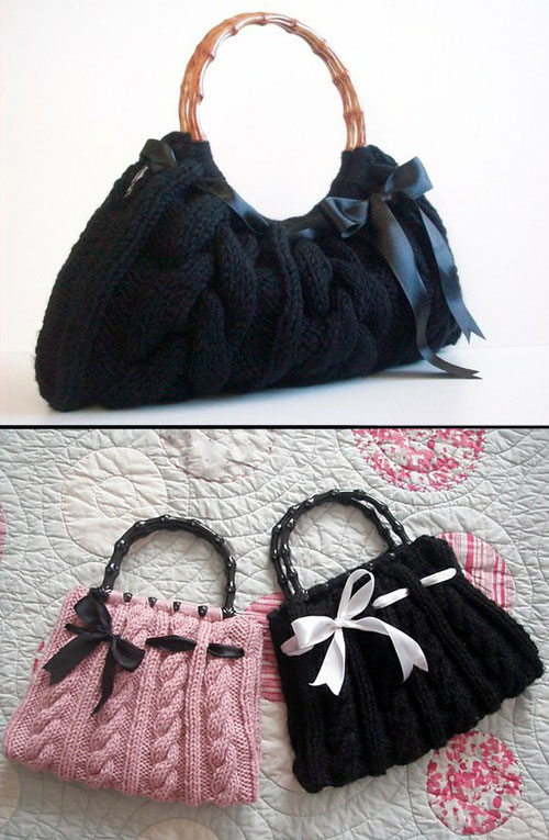 Еще один вариант – обрезать свитер сверху параллельно нижнему краю, сшить по низу и пришить круглые ручки или ручки любой другой формы, купленные в магазине фурнитуры или отрезанные от какой-нибудь старой сумки. Украсьте сумку, протянув в нее ленту и завязав ее на бант. Получается очень красиво!!