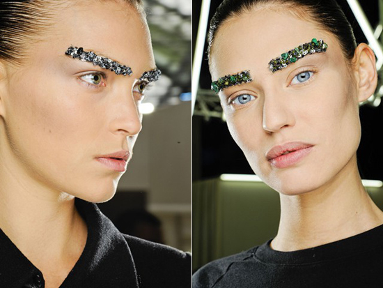 Только один человек способнен привносить столь экстравагантные тенденции в мир моды. И это никто другой, как Карл Лагерфельд/ Karl Lagerfeld. На фэшн-шоу Chanel осень-зима 2012/2013 дизайнер украсил своих моделей жирненькими блестящими бровушками. Эти накладные бровки выполнены в из различных минералов и камней на жемчужной основе, и украшены блестками, паетками и биссером.