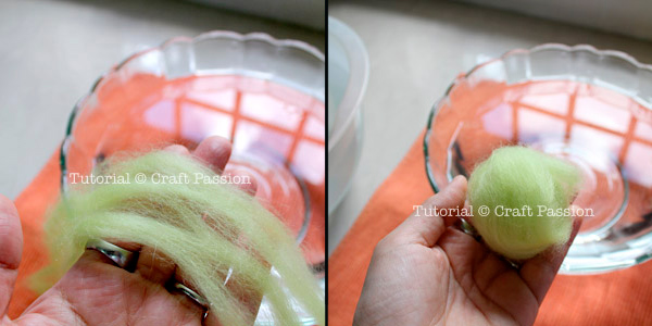 Подготовьте заранее все материалы. Стол застелите скатертью или салфетками. Убедитесь, что горячая вода не слишком горячая, чтобы вы не обожглись. Разделите шерсть для валяния на небольшие пряди по 2-3 грамма. Можете разделить 20-граммовый пучок на 8 одинаковых прядок, тогда и ваши яички будут примерно одинакового размера.