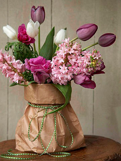 Букет из не очень официальных или полевых цветов можно поставить в любую баночку или вазу. Но оберните ее бумажным пакетом, перевяжите лентой или веревочкой, и букетик будет смотреться, как стильная компзиция, прекрасно дополняющая ваш интерьер.