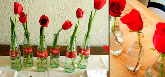 Не кустовые цветы будут прекрасно смотреться по-одиночке. Если вам подарили красные тюльпаны или розы, или другие цветы насыщенных цветов, расставьте их в ряд в стеклянные бутылки из-под напитков, например, Кока-Колы.