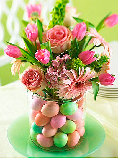 И, конечно же, идея для Пасхи. Вам понадобится простой прозрачный стакан, банка той же высоты, но гораздо большего диаметра, яичная скорлупа и красители для яиц. Опустошите и высушите яичную скорлупу, потом окрасьте ее, как пасхальные яйца. В центр банки поместите стакан, по кругу него выложите крашеные «яйца». Наполните стакан водой и поставьте в него свой букетик. Получится замечательное украшение для пасхального стола!!