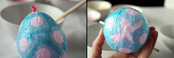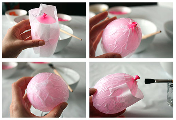 Надуйте шарики до той степени, пока они не приобретут нужный размер и форму яйца. Оберните шарик полоской белой бумаги, совпадающей по ширине с длинной шарика. Начиная от цетра, аккуратно смазывайте бумагу клеем или крахмалом, продвигаясь постепенно к широкому, затем к узкому концу шарика. Все неровности и торчащие складки можно сгладить, смазав их еще раз клеем и прижав.