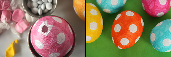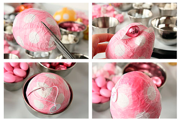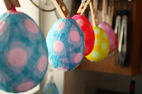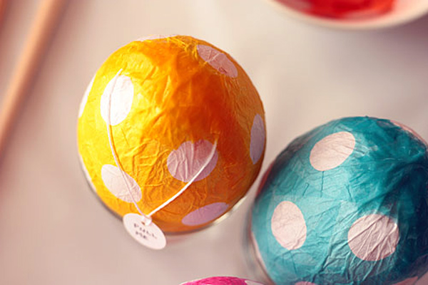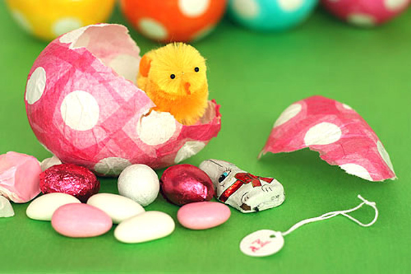 Если у вас есть детки, племянники или к вам в гости придут друзья со своими малышами, отличным способом порадовать ребятишек станут эти пасхальные яйца из папье-маше. Они делаются из папиросной (или любой другой тонкой) бумаги, а внутрь такого яичка можно поместить небольшой сюрприз в виде конфеток или маленькой игрушки, который непременно порадует ребенка.