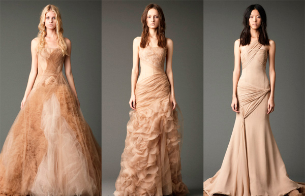 Если же вы подыскиваете что-нибудь более оригинальное, возможно вам понравятся платья, в которых прекрасно сочетаются бежевый и черный. Черный цвет придает силуэту строгости, но наверняка не каждая невеста согласится надеть что-нибудь подобное, по крайней мере на свою первую свадьбу. Хотя, если вы будете шить платье, то бежевый с черным можно заменить на белый с бежевым или просто разными оттенками бежевого.