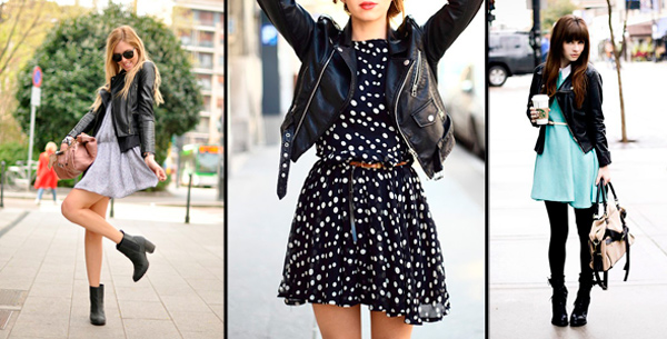 1. Кожаная курточка под платье. Как ни странно, кожаные курточки прекрасно сочетаются с легонькими платьицами. Главное, выбирайте курточку потоньше и покороче, чтобы она не выглядела как верхняя одежда. Дополните курточку черными колготками или ботиночками в цвет – в данном случае обувка по стилю должна сочетаться именно с курткой. Отдайте предпочтение грубоватым кожаным туфелькам или ботиночкам, и ваша фигурка в новом платице будет выглядеть еще изящнее.