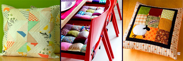 Отдельным полем для лоскутного творчества являются подушечки: всякие и разные. Как ни странно, из лоскутов получаются прекрасные интерьерные подушки, которые несложно подогнать под стиль любого интерьера. Кроме того, лоскутные подушечки сделают уютнее любой диванчик, лавочку и даже старые кухонные стулья. А исходя из выбранных материалов, вы таким образом можете поставить цветовой акцент на дизайне каждой из комнат.