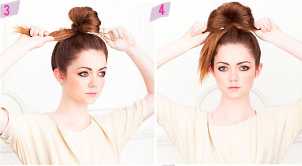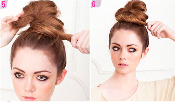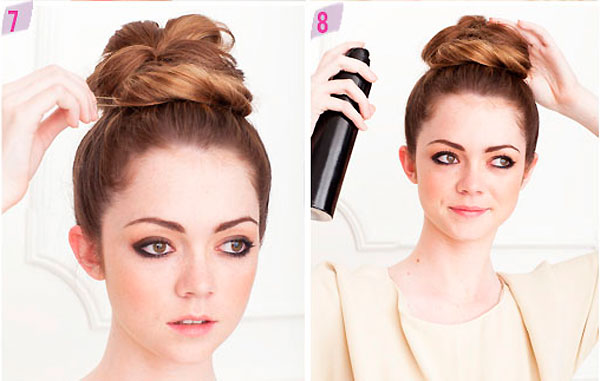 Уложите петлю из волос так, чтобы она лишь придала пучку высоты или объема (на ваше усмотрение). Ее также закрепите шпильками, после чего зафиксируйте всю прическу лаком для волос.