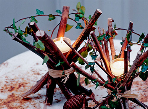 2. Еще одна оригинальная идея – подсвечники из тех же веточек. Нарежьте веточки примерно одинаковой длины и, немного скрутив их, свяжите веревкой, лентой или полоской ткани. Украсьте веточки искусственной зеленью, лентой, ниткой с бусинками и всем, что придет в голову. В центр готового подсвечника поместите обычную свечку – таблетку.