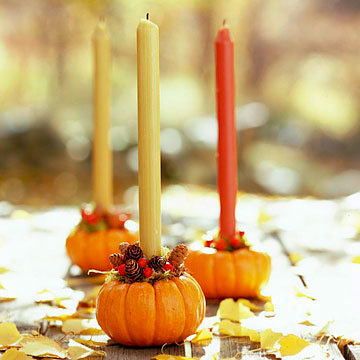 3. Кроме того, инетресные подсвечники можно сделать и из тыкв. Почистите маленькую тыковку от внутренностей. Насыпьте в нее песка или меских камешков, которые помогут свечке держаться вертикально. А сверху украсьте подсвечник шишечками, желудями, сушеными ягодами рябины, лентами, бусинками и т.д. Такие свечи станут прекрасным украшением любого праздничного стола и отлично подойдут для Хеллоуина.