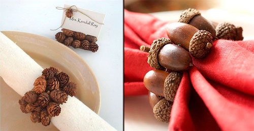 5. Из желудей и небольших шишек также можно соорудить украшения для салфеток. Нанизайте их на тоненькую нитку, и обвяжите салфетки для гостей. То же самое можно сделать и с ленточками по краям, чтобы когда вы обвяжете салфетку, шишечки или желуди дополнял еще и яркий атласный бантик.