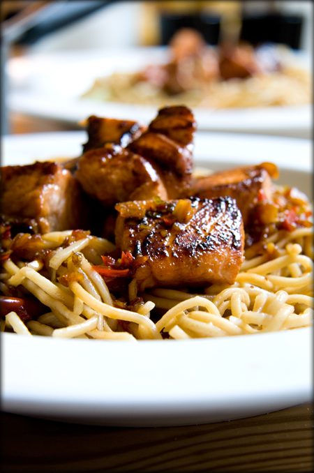 Теперь собственно рецепт. Нам понадобится полкилограмма свинины, соевый соус, сахар или мёд, лук, сладкий перец, имбирь, кунжут, рисовая лапша.