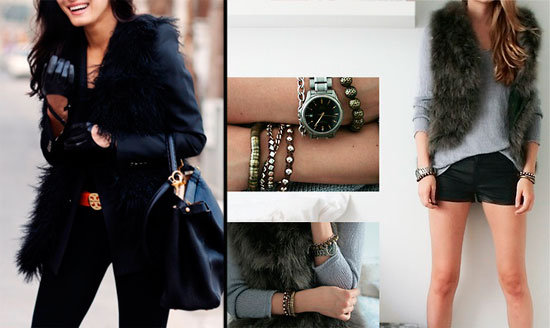 Когда же станет прохладнее, меховую жилетку без проблем можно надеть на свитер с длинным рукавом или даже пиджак. Чтобы ваш наряд не смотрелся слишком просто, добавьте аксессуаров на руках (часы, браслеты, перчатки).