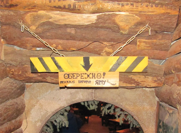 Сама кафешка очень хорошо оформлена, продумана каждая деталь. Особенно мне понравилось меню, напечатанное на желтой, вроде старой бумаге. И, конечно же, много обслуживающего персонала, одетого в ту же военную форму. Здесь вы увидите только молоденькитх парней и девушек, которые также будут подшучивать над вами «Не москали ли вы» или «Возможно, вы под москалями были» (если вы – девушка). В руках у некоторых парней были пистолеты с холостыми патронами, которые дают вспышку и звук выстрела. Один из них выпалил из такого пистолета, когда я стояла рядом. Это было, мягко говоря, неожиданно.