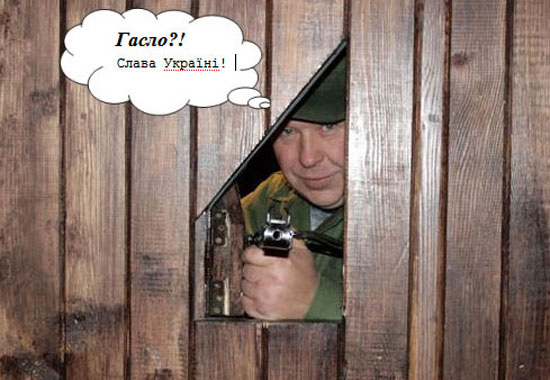 Итак, зайдя в нужную арку мы таки наткнулись на нужные двери. Нам даже не пришлось стучать (у них есть камера), человек в серо-зеленой солдатской форме на входе сразу открыл окошко, потом открыл двери. Окинув нас взглядом, он спросил лозунг. Не долго думая, я выпалила: «Слава Україні!». Он же ответил, как положено: «Героям Слава!».