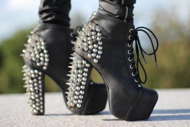 Обувь осенне- зимнего сезона также украшена шипами. Интересно смотрятся модели, как на плоской подошве, так и на каблуках: кожаные байкерские сапоги, стильные ботильоны из замши, вечерние туфельки Christian Louboutin, украшены острыми шипами сзади, или на носке, либо сбоку. Такая обувь добавляет образу сексапильности. Будет дополнением к маленькому черному платью, джинсам, легинсам, платью с болеро, приталенному жакету.