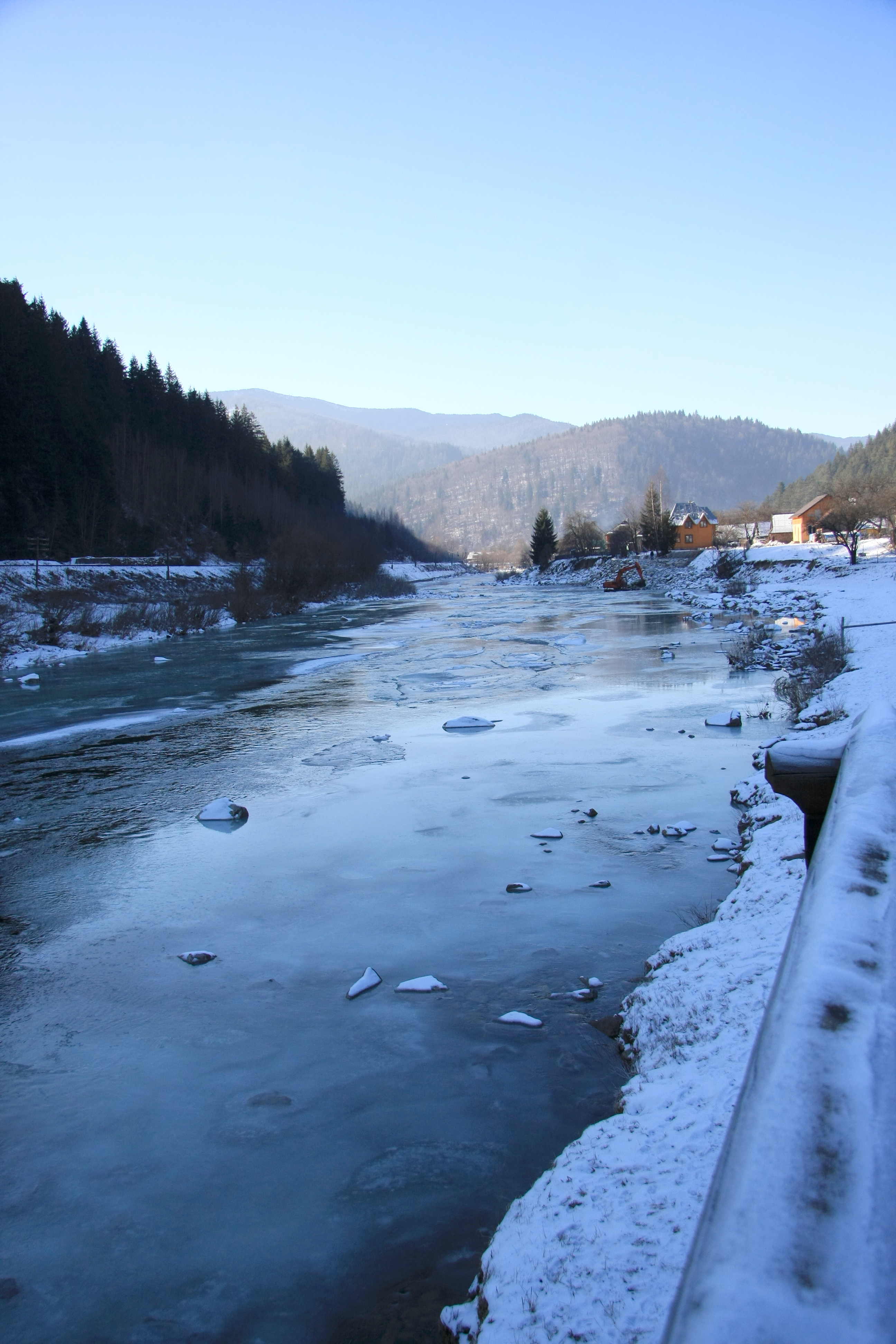 Оба домика стоят прямо на берегу живописной горной реки. А на противоположной стороне высится гора, покрытая соснами. У её подножия проходит железная дорога. И мы частенько могли наблюдать за спешащими по своим делам поездами.