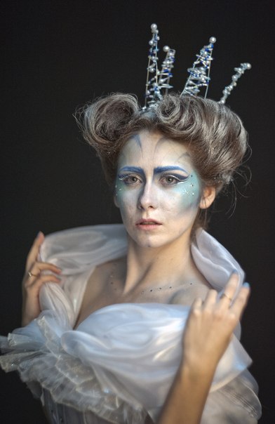 Макияж снежной королевы холодный и завораживающий. В таком макияже мастер использует тени, кисти, румяна, консилер, палетку теней и тональную основу с розовым оттенком. Консилер белого цвета нанести от лица к внешним уголкам глаз.