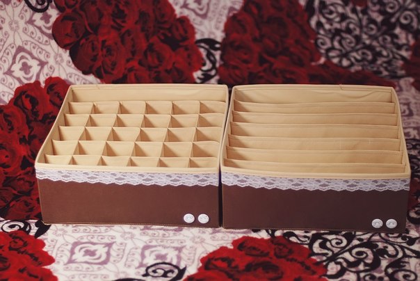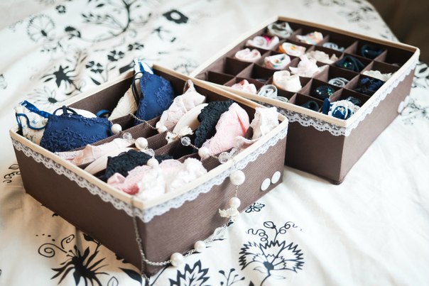 С помощью такой незамысловатой коробочки вы можете хранить свое нижнее белье: отдельные секторы для бюстгальтеров и трусиков. Такая коробочка замечательна тем, что вещи хранятся в идеальном порядке и они на виду. А в шкафу или на полочке вам пришлось бы перерыть стопку, чтобы достать стринги любимого цвета…