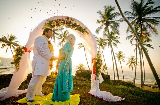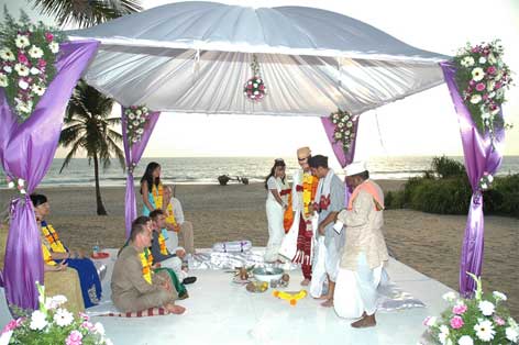 Если вы хотите создать сказочную индийскую атмосферу, лучше всего проводить свадьбу на открытом небе или на пляже. Это не только красиво, но и очень романтично. Для самой церемонии вам необходим некий шалаш, который украшен яркими желтыми цветами. Они символизируют красоту и невинность невесты. Также вам нужны пальмы, они могут быть и искусственными.