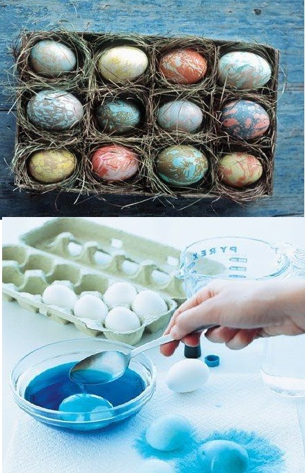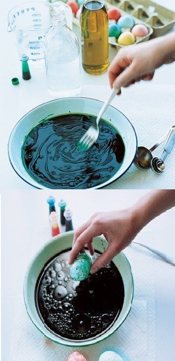 С помощью краски. Обыкновенно красим яйца в краске в кастрюльке, по инструкции. Затем ждем, чтобы яйца подсохли. В отдельную емкость с краской темного оттенка нужно добавить столовую ложку растительного масла. Нужно хорошо перемешать ложкой. Нужно каждый раз перемешивать перед тем, как туда опускать яйцо.