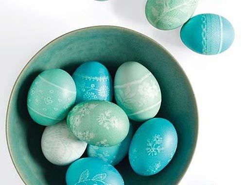Кружевные узоры. Эта технология украшения яиц заключается в том, чтобы аккуратно наложить желаемый трафарет и выдерживать в красителе определенное время. Чтобы сделать нежный ажурный узор, используйте кружево. Оно может быть вязаным либо плетеным. Можно также использовать ненужные остатки капрона или тюли.