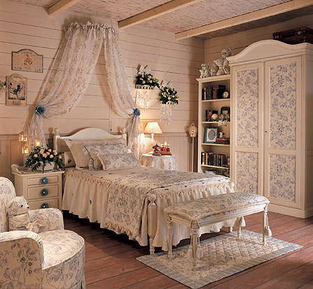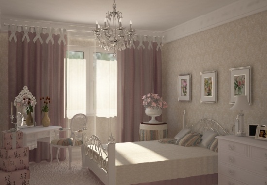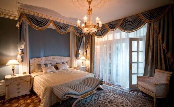 Интерьер спальни должен быть комфортным, уютным, не мешающим жить. Она может быть декорирована в стиле английского или французского загородного дома. Около кровати может быть балдахин или прикроватная банкетка. Может стоять старинный шкаф или комод, инкрустированный слоновой костью.