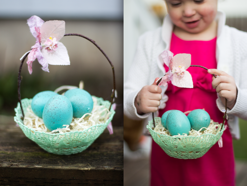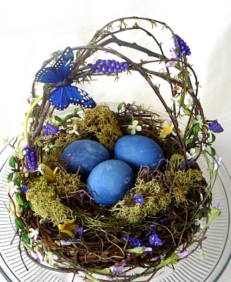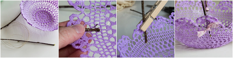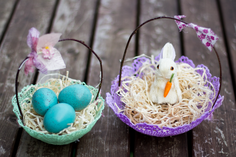 Вот такую оригинальную корзинку для яиц можно сделать за очень короткое время и без особых затрат. Все, что вам может понадобиться, это кружевная небольшая салфетка, клей ПВА, тарелка или пиала, веточка, с которой будет сделана ручка корзинки.