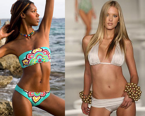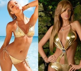 Раздельные купальники. Поклонницам такого фасона следует выбирать блестящий купальник золотистого или серебристого оттенков. Они придают образу соблазнительности, оттеняют загар и подчеркивают фигуру. Отличным дополнением послужат массивные украшения или оригинальные аксессуары.