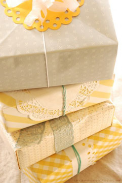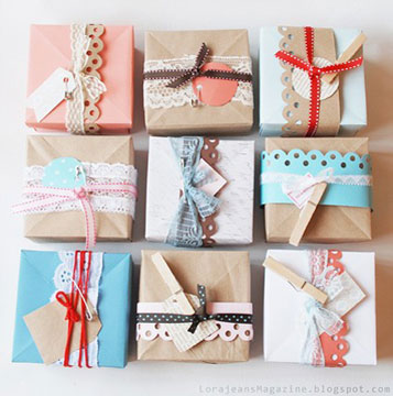 Вариант 2. Если вы хотите, чтобы ваш подарок выглядел более нежно, возьмите однотонную бумагу или что-нибудь с неярким мелким орнаментом. Отличным дополнением к общему виду такого подарка станет небольшое бумажное или тряпичное кружево, обвязанное тоненькой контрастной лентой. На кружево легко можно прицепить небольшую бирочку с именем дамы, которой адресован подарок, или небольшим пожеланием для нее.