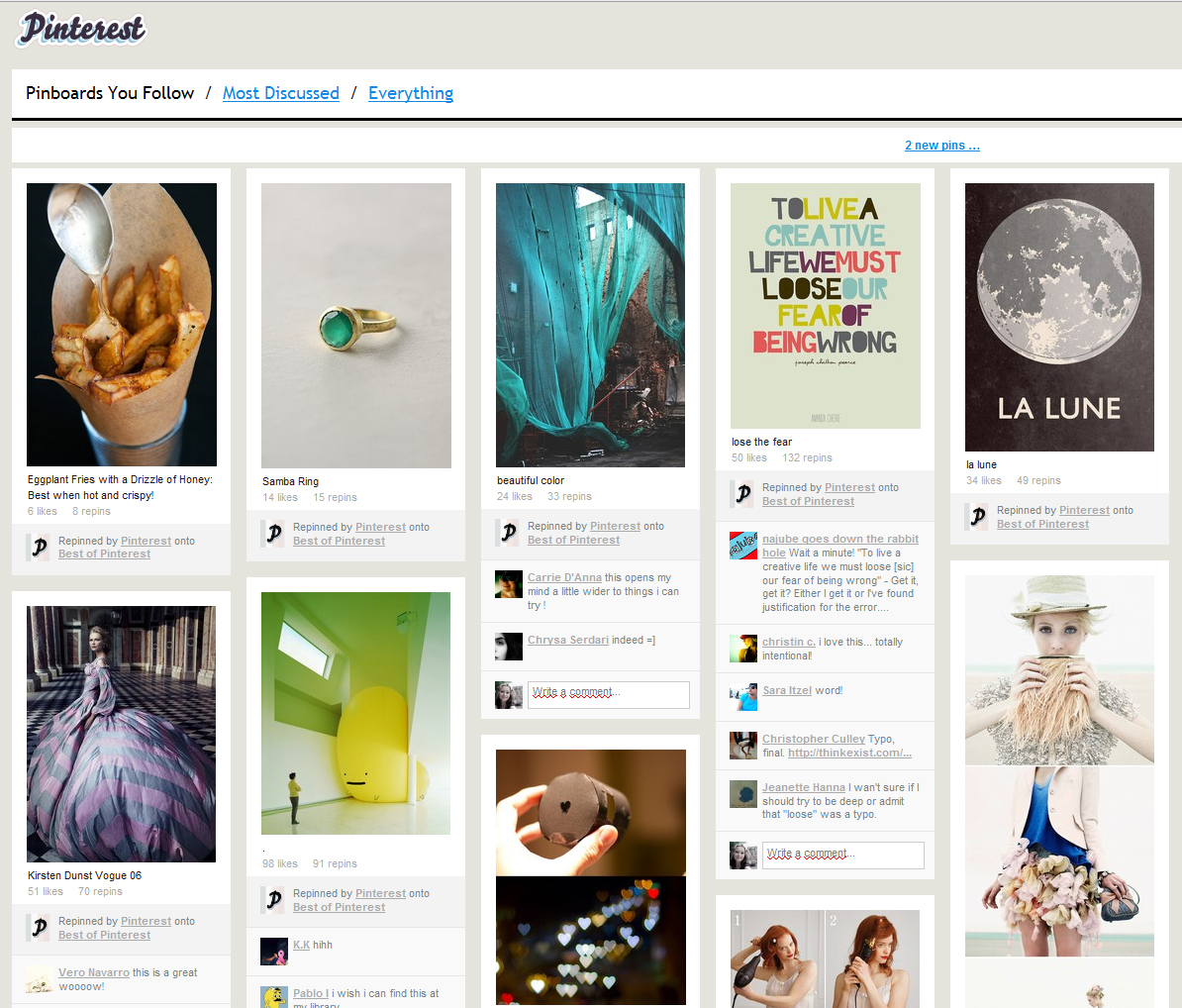 Начну со своих любимых слов. Бороздя просторы интернета, я наткнулась на один преинтереснейший, а главное очень полезный для дизайнеров и не только, сайт. Представляю Вашему вниманию Pinterest! Этот портал является таким себе своеобразным коллективным каталогом разнообразных картинок. Хотя ресурс стартовал недавно, но уже успел стать многообещающим и даже, правда не по своей воле, поучаствовал в скандале. Скандал же разгорелся из-за высказываний пользователей Twitter о том, что MySpace полностью скопировал дизайн с Pinterest.