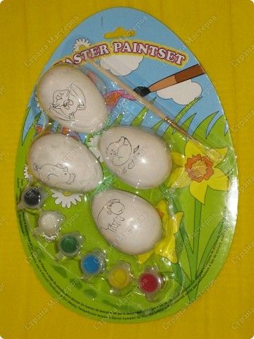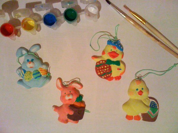 Комплект состоял из 4-х гипсовых фигурок (зайчики и цыплята с пасхальными атрибутами), красок и кисточки. Они выглядели так мило, что мы не удержались и всё-таки купили один набор.