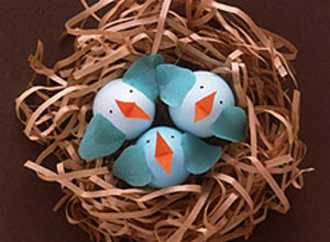 Идея №1: Пасхальные цыплята. Вы можете взять белые или коричневые яйца, или же окрашенные в какой-нибудь светлый тон. После этого вырежьте крылышки из гофрированной бумаги и клювики (маленькие ромбики) из простой цветной бумаги. Приклейте аккуратно крылышки по бокам, а также клювик, сложив красный ромбик пополам и приклеив его середину на кончик яйца. Черным фломастером нарисуйте глазки.