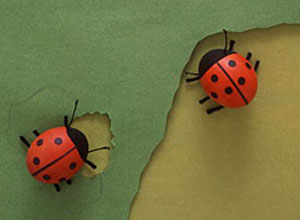Идея №2: Божьи коровки из яиц. Покрасьте яички в красный цвет, затем черным фломастером нарисуйте ей мордочку (голову) и разделите тельце на два крылышка продольной полосой. Круглые пятнышки делаются из черной бумаги, вырезанной дыроколом, которая приклеивается клеем. Или же, чтобы максимально упростить работу, возьмите черный оракал. Лапки насекомого сделайте из кусочков черной пряжи, усики – из черных ниток. Приклейте их аккуратно одним кончиком у основания – пузика божьей коровки.