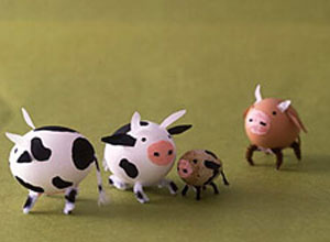 Идея №3: Пасхальные коровки. Берите белые яички для пятнистых коровок и коричневые – для коричневых быков. Перепелиные яйца отлично сгодятся для создания телят. Нарисуйте черным фломастером пятнышки на теле коровки и глазки, розовым – мордочку. Рога и ушки выполняются из белой и черной гофрированной бумаги соответственно, хвостик – также из пряжи. Здесь самое сложное – приделать корове ножки. Для этого возьмите кусочки палочек для чистки трубки и приклейте (или можете воткнуть их в проделанные отверстия, если это только скорлупа) так, чтобы коровка могла на них стоять.