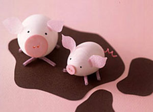 Идея №4: Пасхальные розовые свинки и поросята. Эти животные делаются подобным образом. Покрасьте яички в розовый цвет, приклейте к ним ушки из гофрированной бумаги. Как всегда, нарисуйте глазки фломастером. Ножки делаются также из палочек для чистки трубки, но сложенных вдвое и приклеенных на середину (изгиб) так, чтобы каждая пара копыт выглядела как перевернутая буква V. Хвостик сделайте из закрученного пучка ниток мулине или тонкой проволоки (опять же, если это только скорлупа), а в качестве пятачка приклейте розовую пуговку.