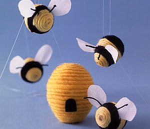 Идея №6: Пасхальные пчелки и улей из яичной скорлупы. Чтобы сделать такую пчелку, вам все-таки придется попыхтеть. Для начала из белой гофрированной бумаги вырежьте крупные овальные крылышки и наклейте их на скорлупу. Затем, возьмите желтую и черную пряжу. Закрепив кончик нитки на конце яичка клеем, смазывайте яйцо тонким слоем клея вокруг нитки и укладывайте нитку вокруг кончика, затем вокруг предыдущего намотанного круга. Чередуйте черную и желтую нитки так, чтобы пчелка была равномерно полосатой. Улей делается так же.