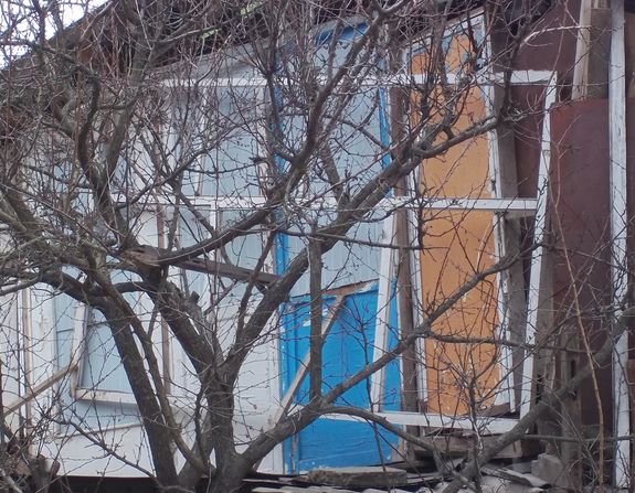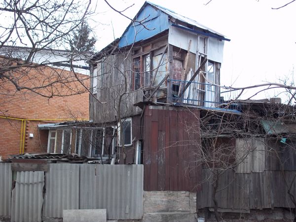 При взгляде на этот, с позволения сказать, дом, возникает целая куча вопросов: «Каким образом автору удалось хоть что-нибудь сделать из этого мусора строительного инвентаря?», «Как всё это в одной куче держится?», «Кто вообще разрешил это соорудить?», и наконец, «Какое функциональное предназначение носит белая оконная рама без стекол (или же это всё-таки элемент декора)?»