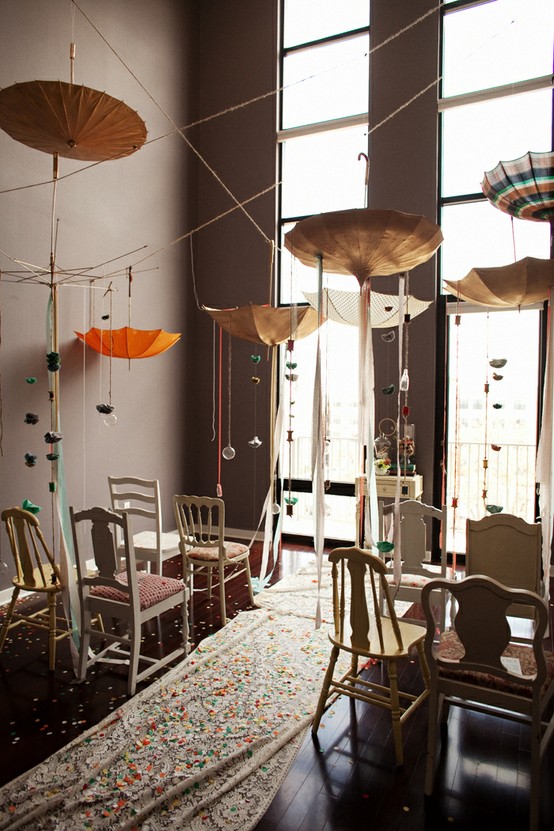 На этом прелести обладания зонтом не заканчиваются. Зонтами можно украшать интерьер. По-моему получается очень мило. Для вечеринки самое оно.