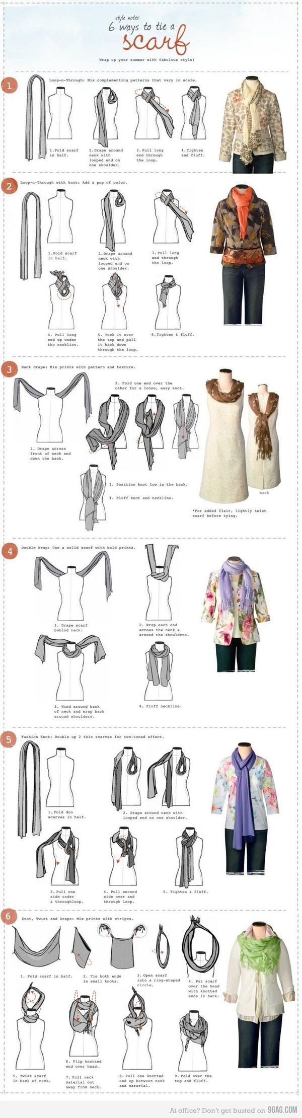 Многое ещё зависит от того каким образом вы расположите на себе шарф. Поэтому я представляю вашему вниманию несколько способов, как повязать шарфик, в подробных схемах.