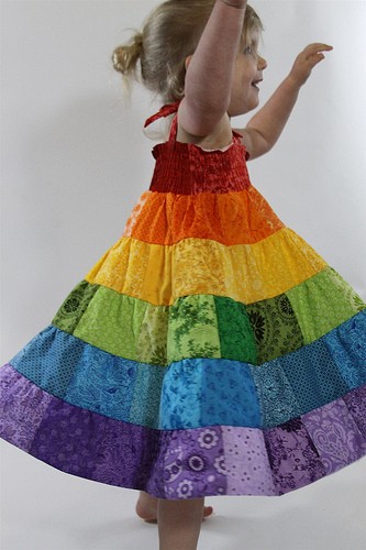 Например, сарафан-радуга. Вы сможете сами пошить такой сарафанчик ребёнку. Правда нужно будет повозюкаться. В идеале требуется подобрать около 30 видов тканей, разрезать их на квадраты, а затем собрать в упорядоченные красивые уровни радуги. Лиф же по задумке должен быть гофрированным.
