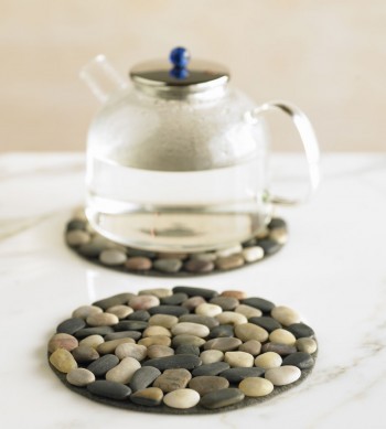 Если вы были на море и там развлекали себя коллекционированием камушков, могу предложить замечательную идею по их применению в быту. Посвятите свободный вечер собиранию паззлов из голышей. Смотрите, какую симпатичную подставку для чайника можно сделать. А то у всех они из можжевельника, пора внести свежую идею.