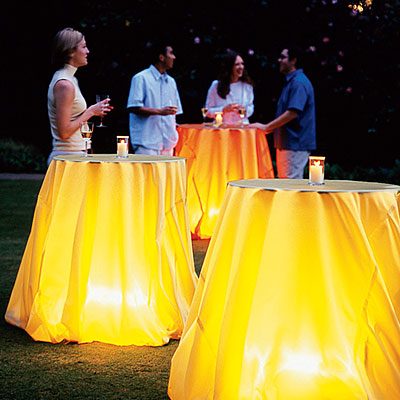 А вот если вы задумали вечеринку на свежем воздухе можете попробовать вот такой вариант освещения. Светящиеся столы создадут атмосферу лёгкой таинственности.