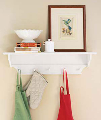 На крючки очень удобно вешать все: фартуки, прихватки, поварежки, разделочные доски… Только располагать такие крючки следует на высоте не менее двух метров, дабы не забрызгать эти вещи жиром или соусами. Очень удачным решением станет навесная открытая полочка с крючками снизу – вы сможете и расположить на ней книги, и повесить то, что всегда должно быть у вас под рукой.