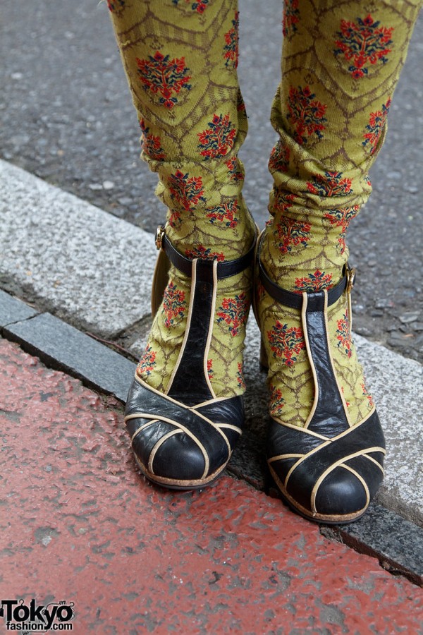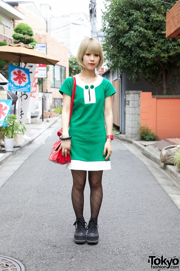 Начнём с 19-летней блондинки Кахо. На ней хорошенькое зелёное платьице а-ля шестидесятные, чёрные чулки с диагональным узором и высокие чёрные кроссовки от Nadia.