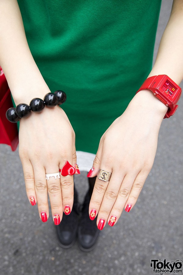 Образ дополняет красная лаковая сумочка, красный маникюр с цветочками-лепесточками, красное кольцо и красные же часы. Вот так вот.