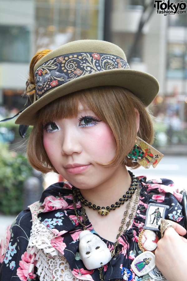 Аксессуаров же на девушке столько, что только успевай рассматривать. Шляпка, серьги в виде игральных карт, на шее крупное деревянное распятие и театральная маска, а также несколько винтажных брошек, браслет и кольца. А также яркие чулки и туфли.