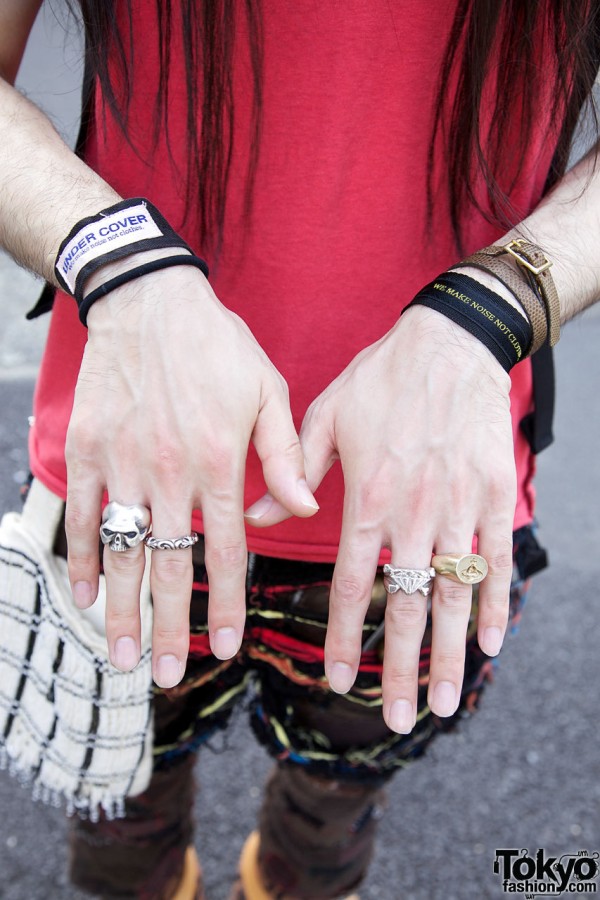 То, что парню нравится бренд Vivienne Westwood подчеркивают и кольца у него на руках. Еще примечательна его набедренная этническая сумка и украшение из металлических монеток.